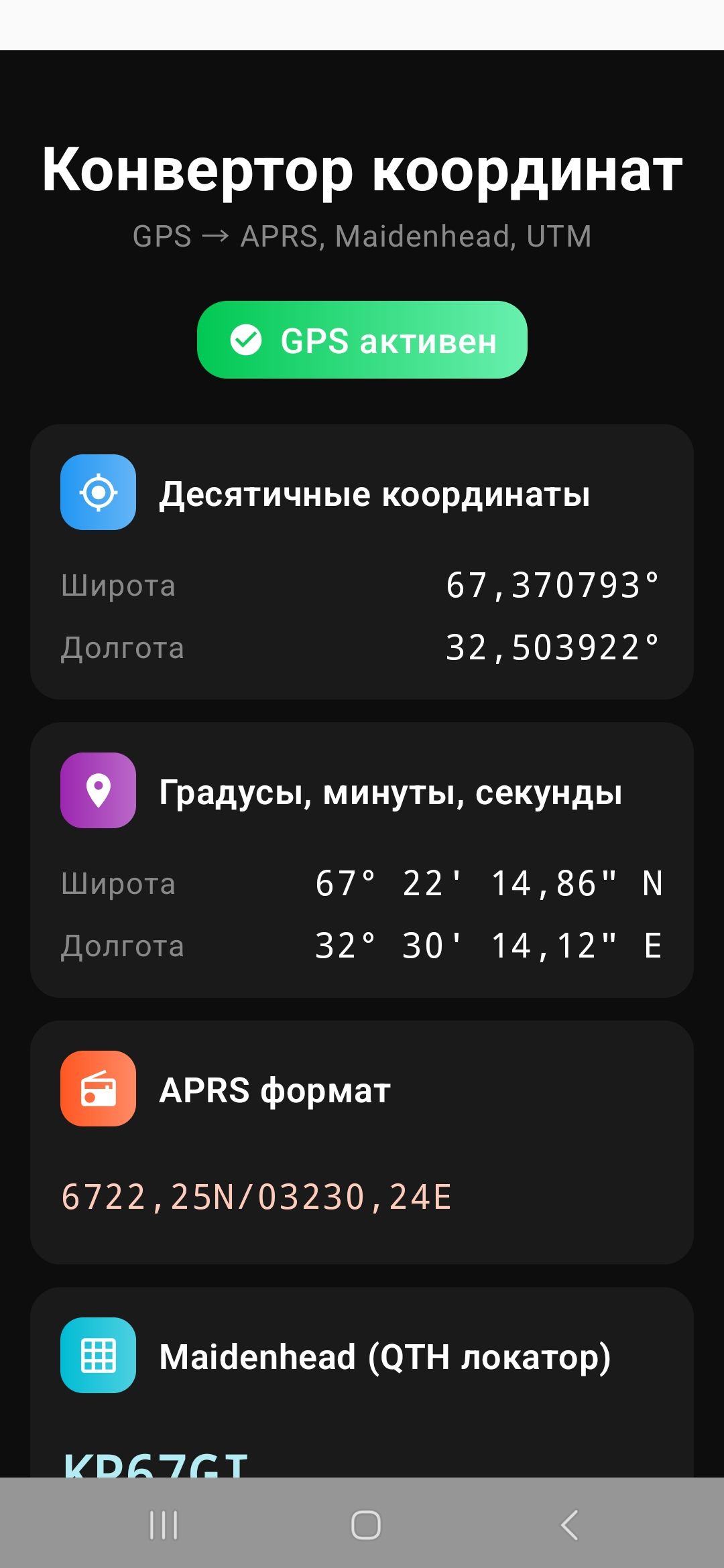 - Конвертация в APRS, Maidenhead, DMS форматы